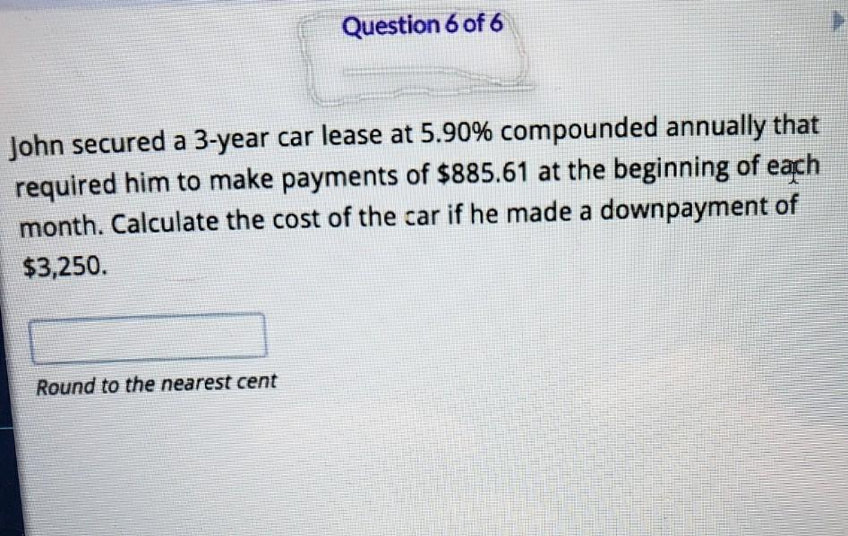 Solved Question 6 of 6 John secured a 3-year car lease at | Chegg.com