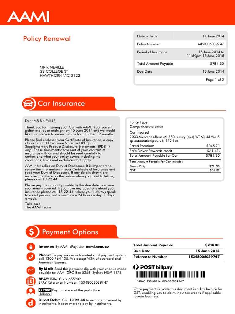 AAMI Car Renewal Account MPA006039747 | Payments | Insurance