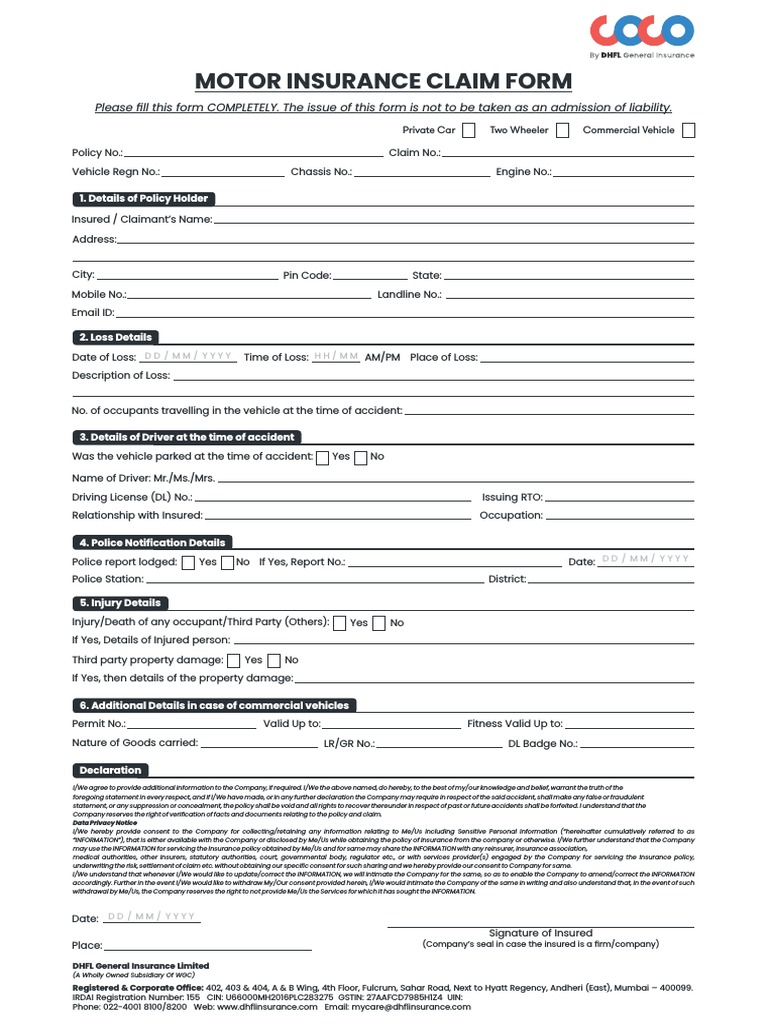 DHFL CLAIM FORM | Vehicle Insurance | Insurance