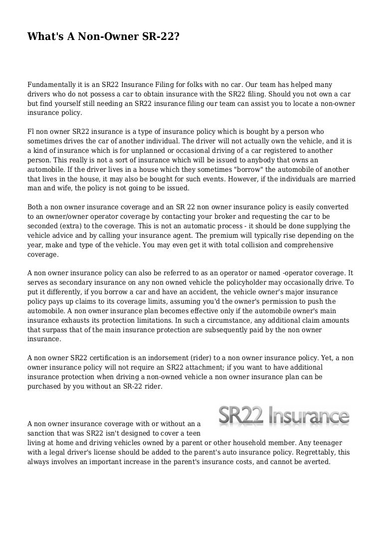 A Named Non Owner Policy is a good option for people who do not own their own car. For instance, many people with a suspended or revoked license will need to purchase a Named Non Owner Policy before they can legally drive again. This type of policy is also a good option for people who drive a company car, drive rental cars, or borrow vehicles from friends or family members.